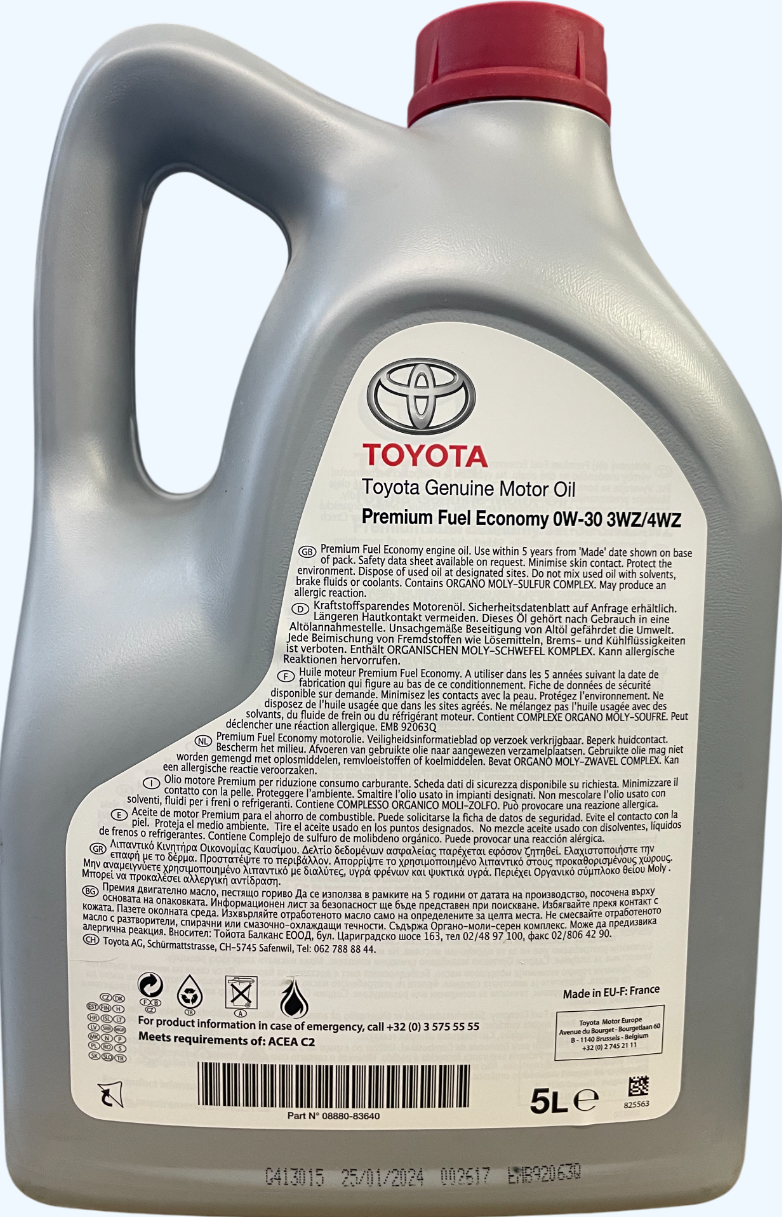 - Аксесуар Моторна олива Toyota Engine Oil 0W30 PFE 3WZ/4WZ 5л (08880-83640) можна замовити на сайті Тойота Центр Київ ВІДІ Аеропорт скориставшись онлайн оплатою та доставкою кур`єрською службою
